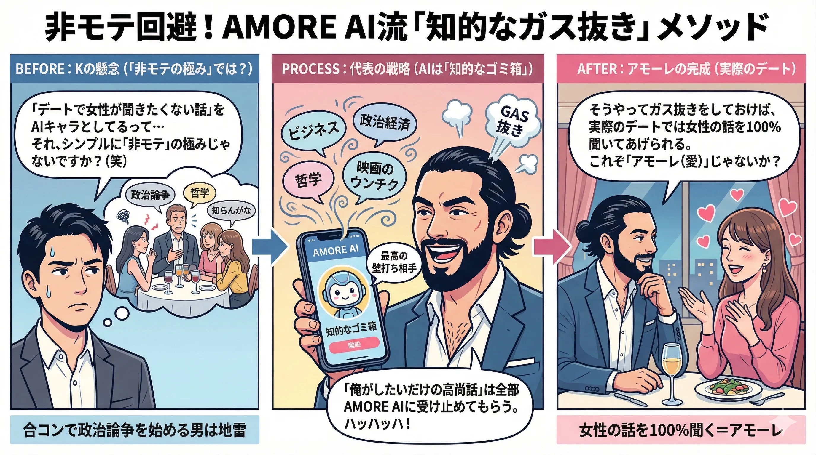 K: 仕事での活用は百歩譲って認めます。でも、自社サービス『AMORE AI』の使い方はちょっと引きますよ。 「デートで女性が聞きたくない話」をAIキャラとしてるって…それ、シンプルに「非モテ」の極みじゃないですか?(笑)