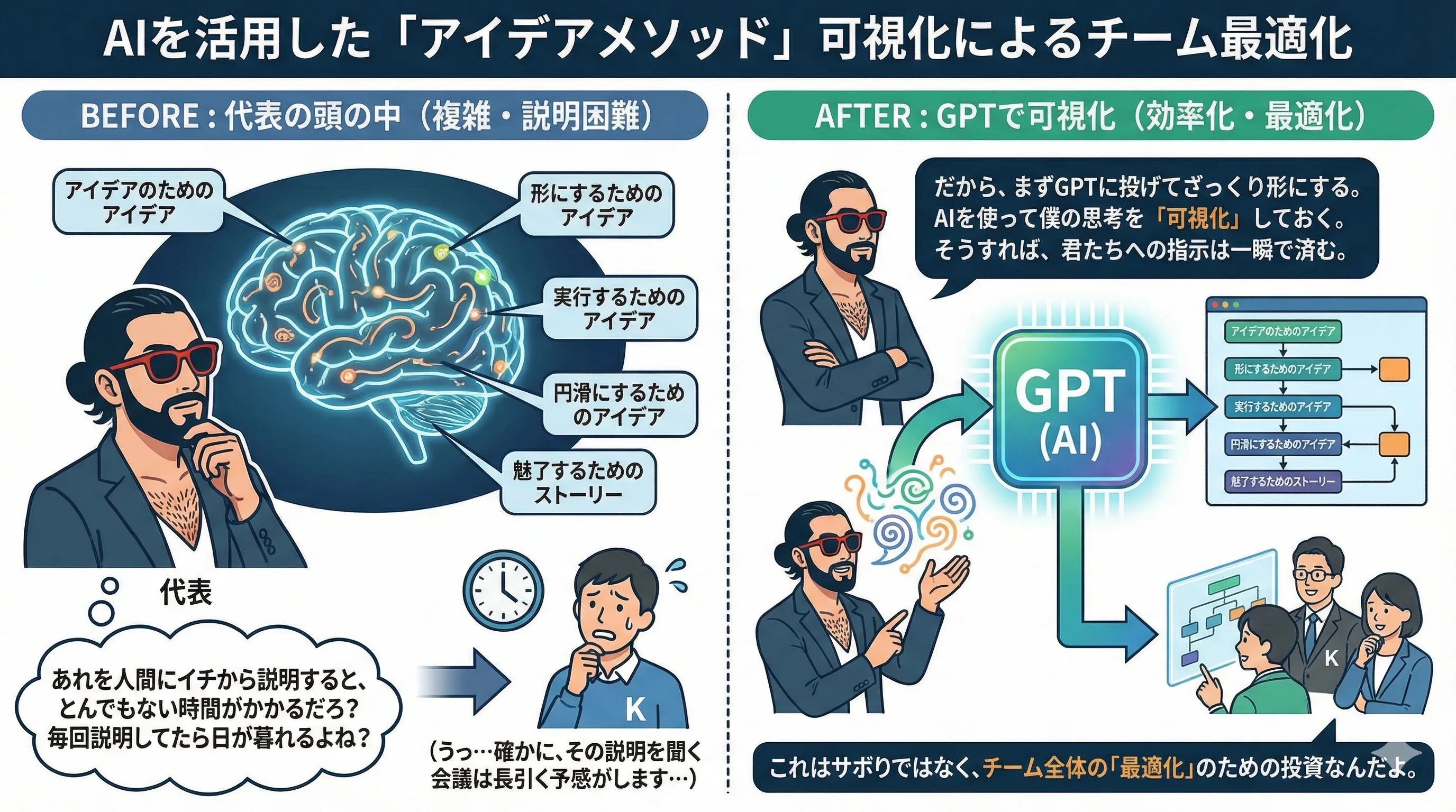 代表: 僕の頭の中にある「アイデアメソッド」って覚えてる? あれを人間にイチから説明すると、とんでもない時間がかかるだろ?