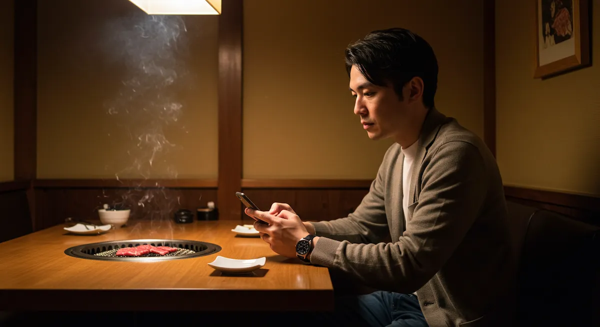 個室にて、フードライターとの打ち合わせを終えた近藤ケント(27)は、ひと息つきながら、iPhoneを眺めていた。