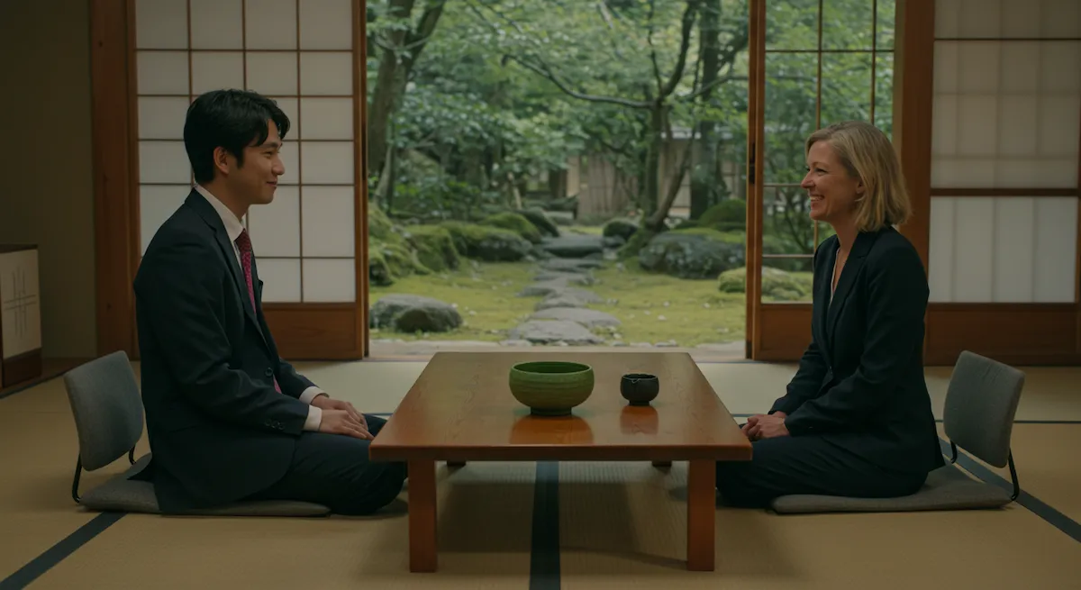 苔むした石畳の奥にある、茶道体験ができる会員制の和室で──