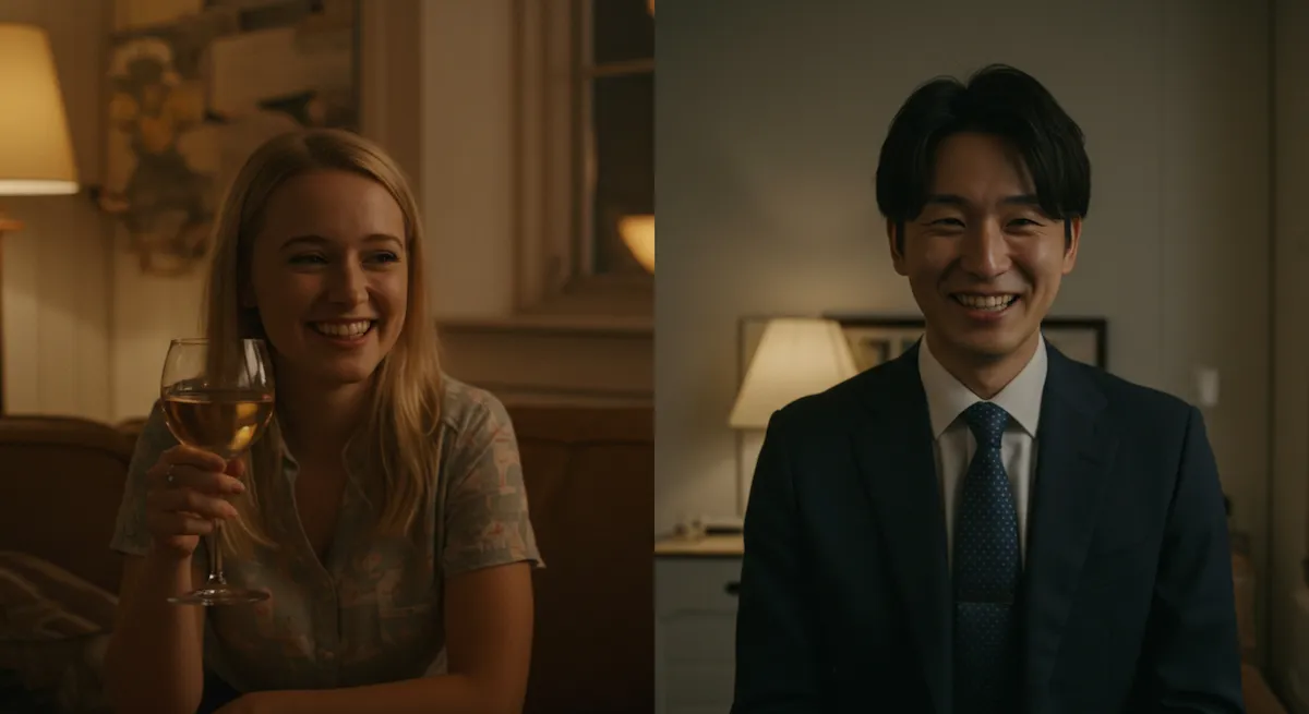 画面の向こうに現れたのは、ワイングラスを持った白人女性キャスト。